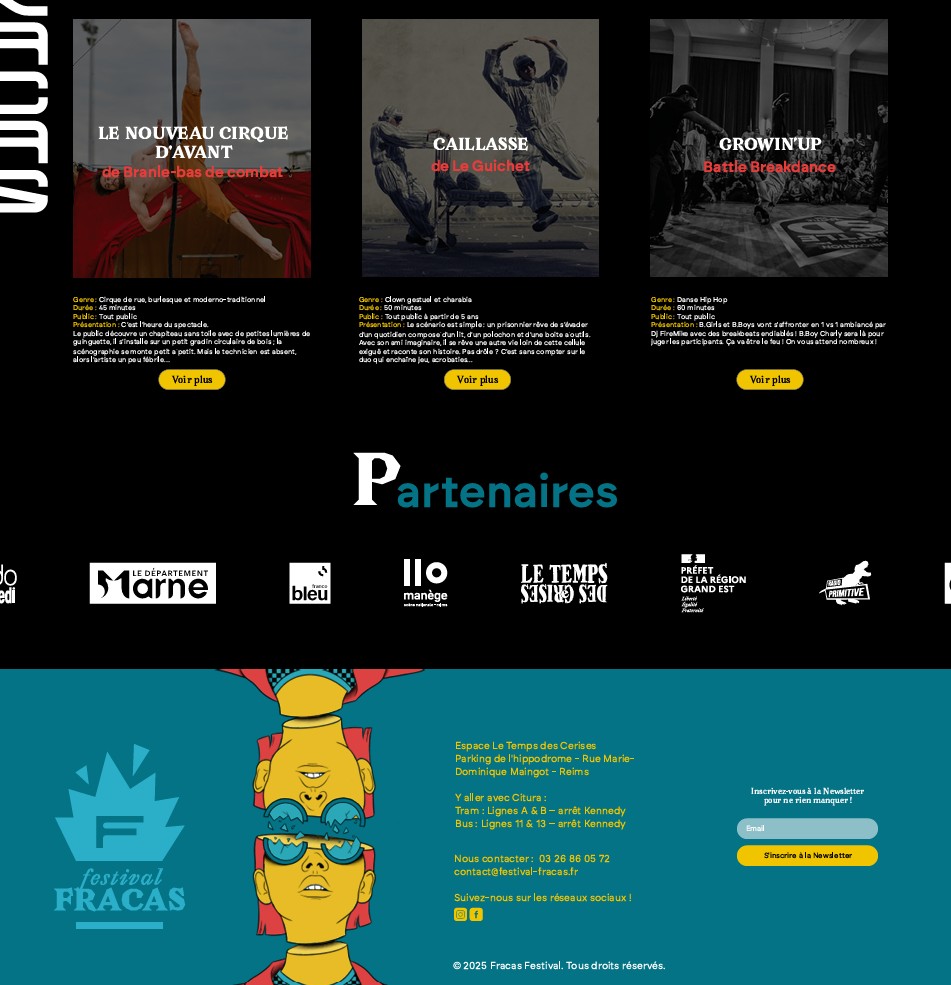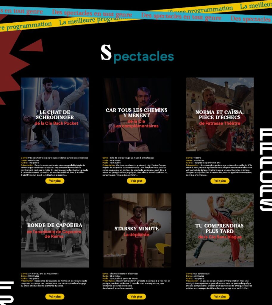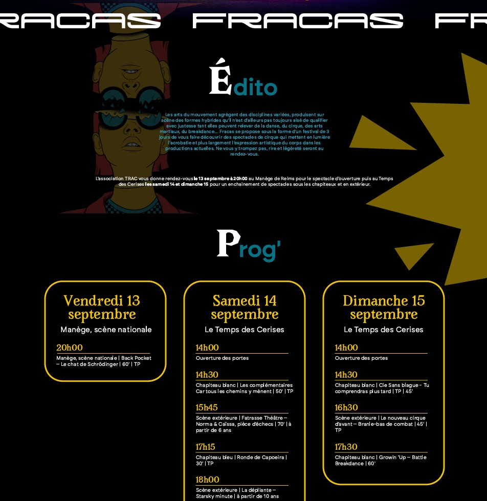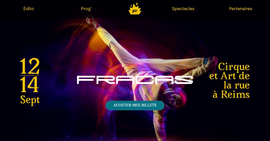 Pour ce projet scolaire, il s’agissait de concevoir la page d’accueil du site internet du festival « Fracas ». La charte graphique, déjà imposée, m’a servi de base pour construire un univers visuel cohérent et immersif. J’ai travaillé à retranscrire l’ambiance du festival directement dans l’interface, en jouant avec les couleurs, la typographie et la hiérarchie des informations. L’objectif était de donner envie aux visiteurs d’en découvrir plus, en captant l’essence du festival dès les premières secondes de navigation.